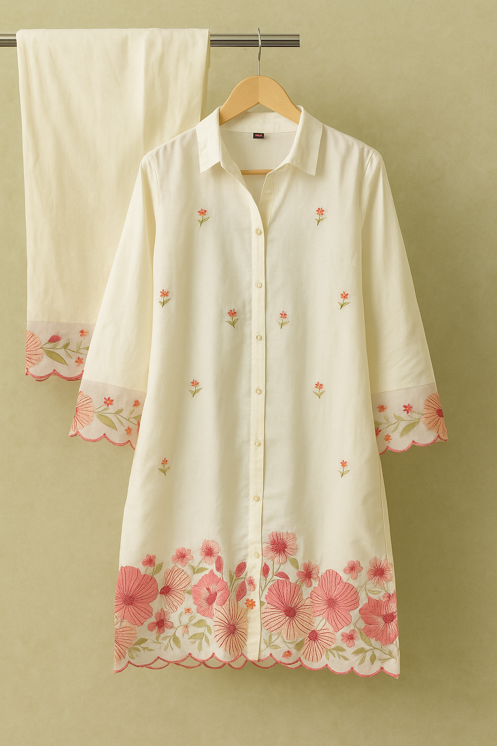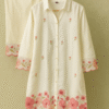 This Off-White Floral Embroidered Co-ord Set is a graceful fusion of minimal elegance and intricate detailing. The kurta features a soft off-white base adorned with dainty pink floral embroidery with Golden Beads across the hem, sleeves, and scattered motifs on the bodice. Scalloped edges on the hemline and cuffs add a refined finish. The lightweight fabric ensures comfort, while the button-down front with a classic collar lends a touch of modernity. Paired with matching trousers, this set is perfect for casual outings, festive brunches, or intimate celebrations.