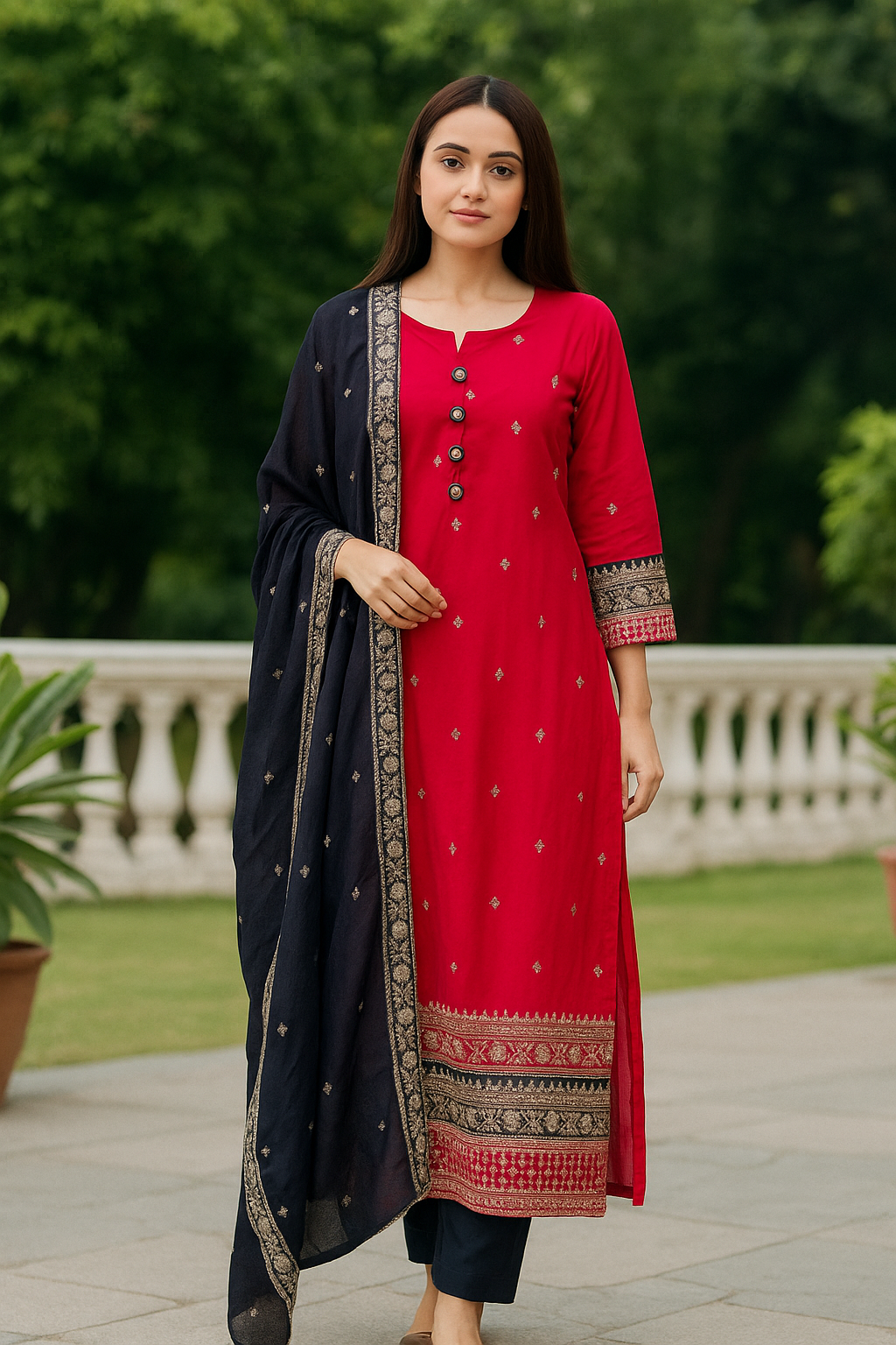 This Hot Pink Embroidered Ethnic Suit Set beautifully blends traditional elegance with same fabric beautiful Potli Pouch .The vibrant  Hot Pink kurta features delicate golden printed motifs and a rich woven border at the hem and sleeve ends, adding a regal charm. Paired with straight  pants and a matching navy dupatta adorned with a golden border and subtle golden work, this ensemble is ideal for weddings, festive gatherings, and cultural celebrations. The soft, breathable fabric ensures all-day comfort without compromising on style.